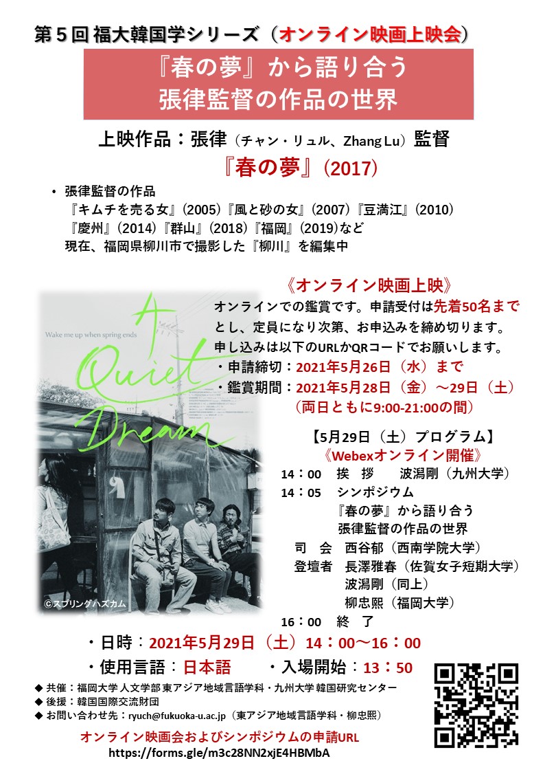 福岡大学人文学部東アジア地域言語学科では、九州大学韓国研究センターと共催で、昨年3月に張律監督の『春の夢』(2017)の上映会の開催を企画しましたが、コロナウイルス感染対策などの諸事情により中止となりました。その後、企画を改めてこの度はオンライン映画上映会およびオンライン・シンポジウムの形で開催することになりましたので、ご関心のある方は奮ってご参加ください。福岡大学の学生はもちろん一般の方もご参加できます。
