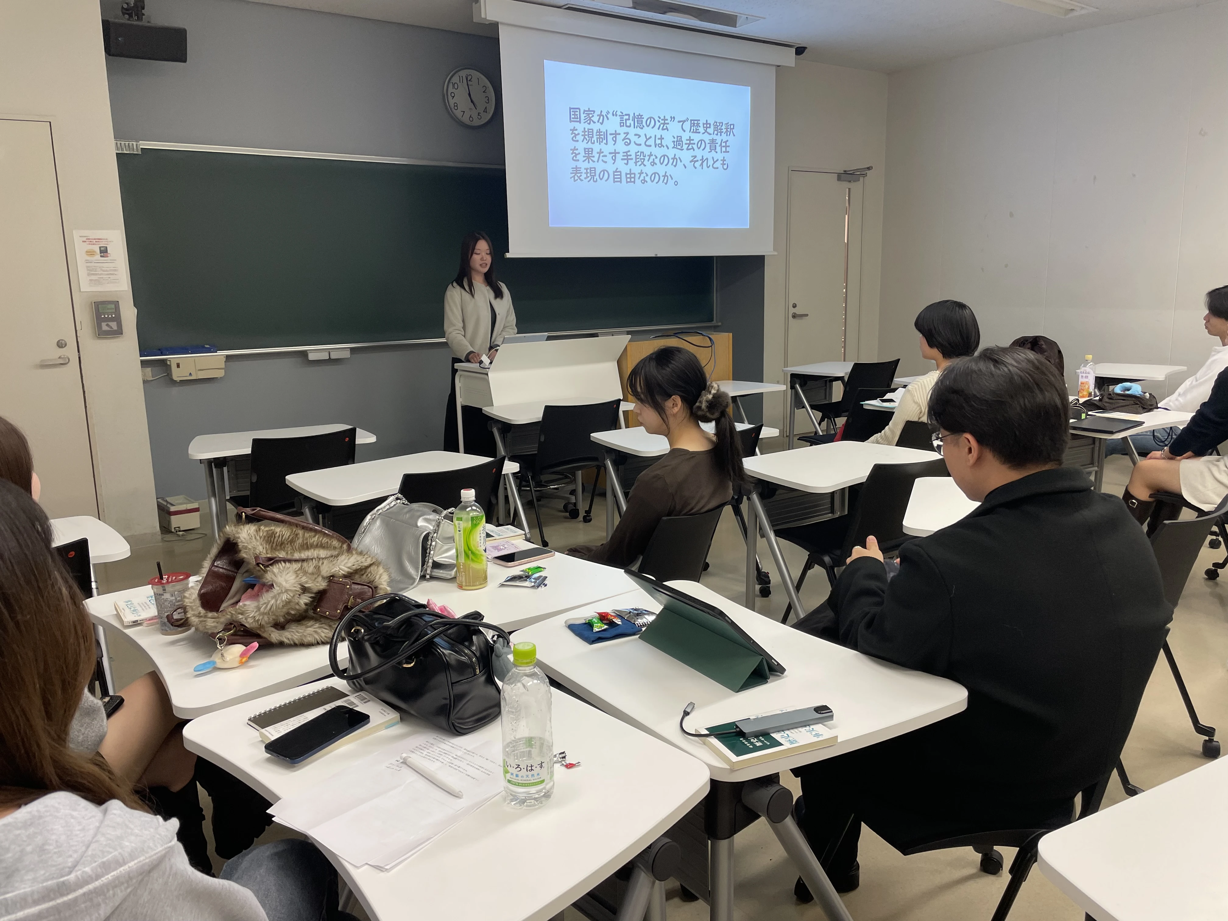 今回、後期の課題であった『歴史修正主義』は、サブタイトルにもあるとおり、主にドイツの事例を扱ったものですが、この書籍を通じ、日本社会における状況、日韓間の歴史認識問題をめぐる「歴史修正主義」、そして歴史認識をめぐる法規制の可能性などに視野を広げ議論ができました。