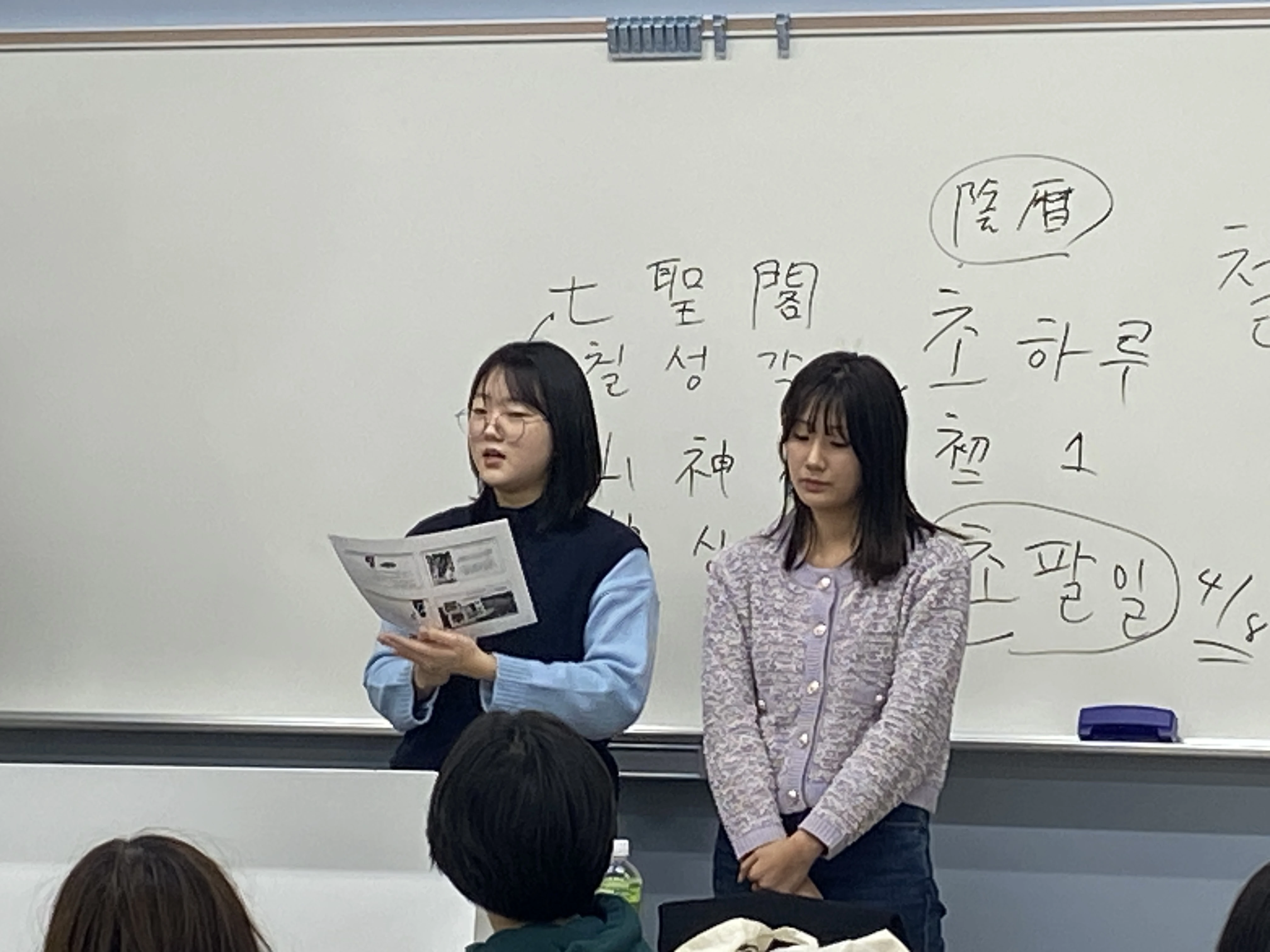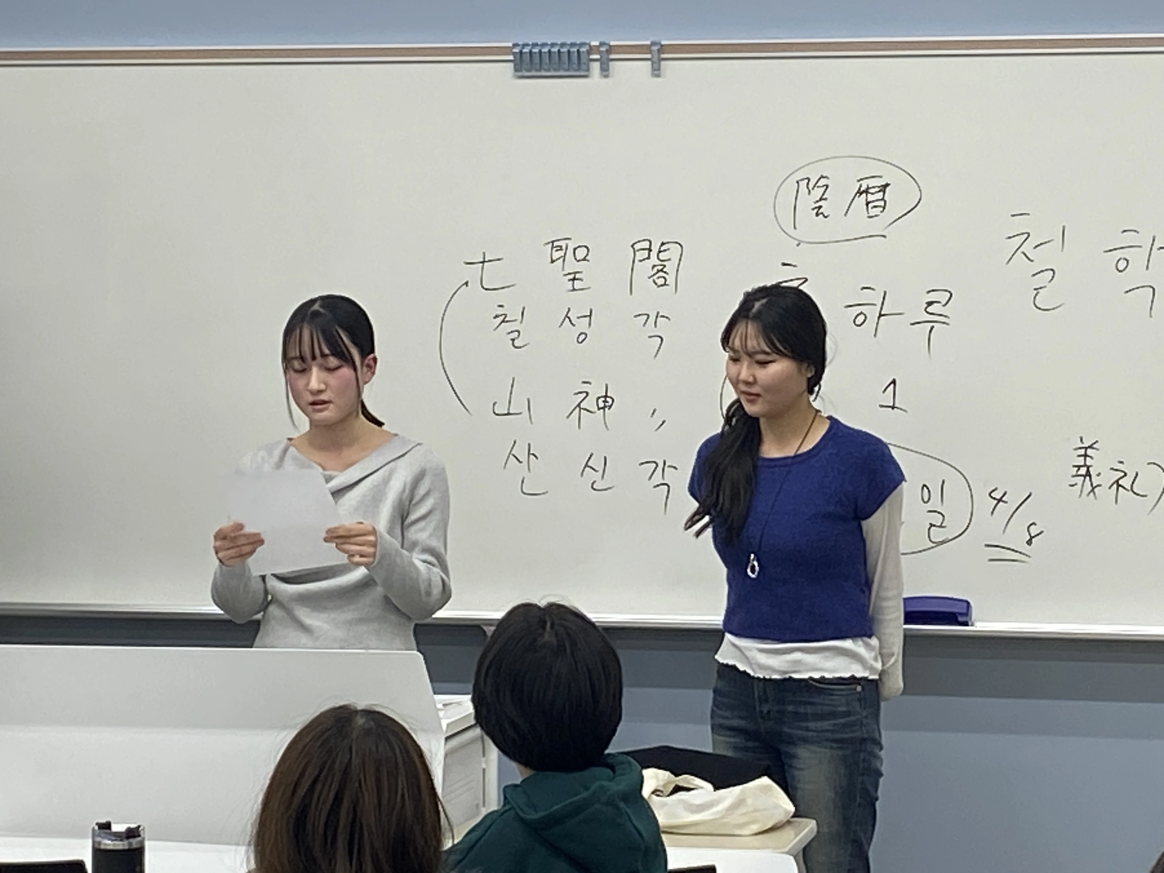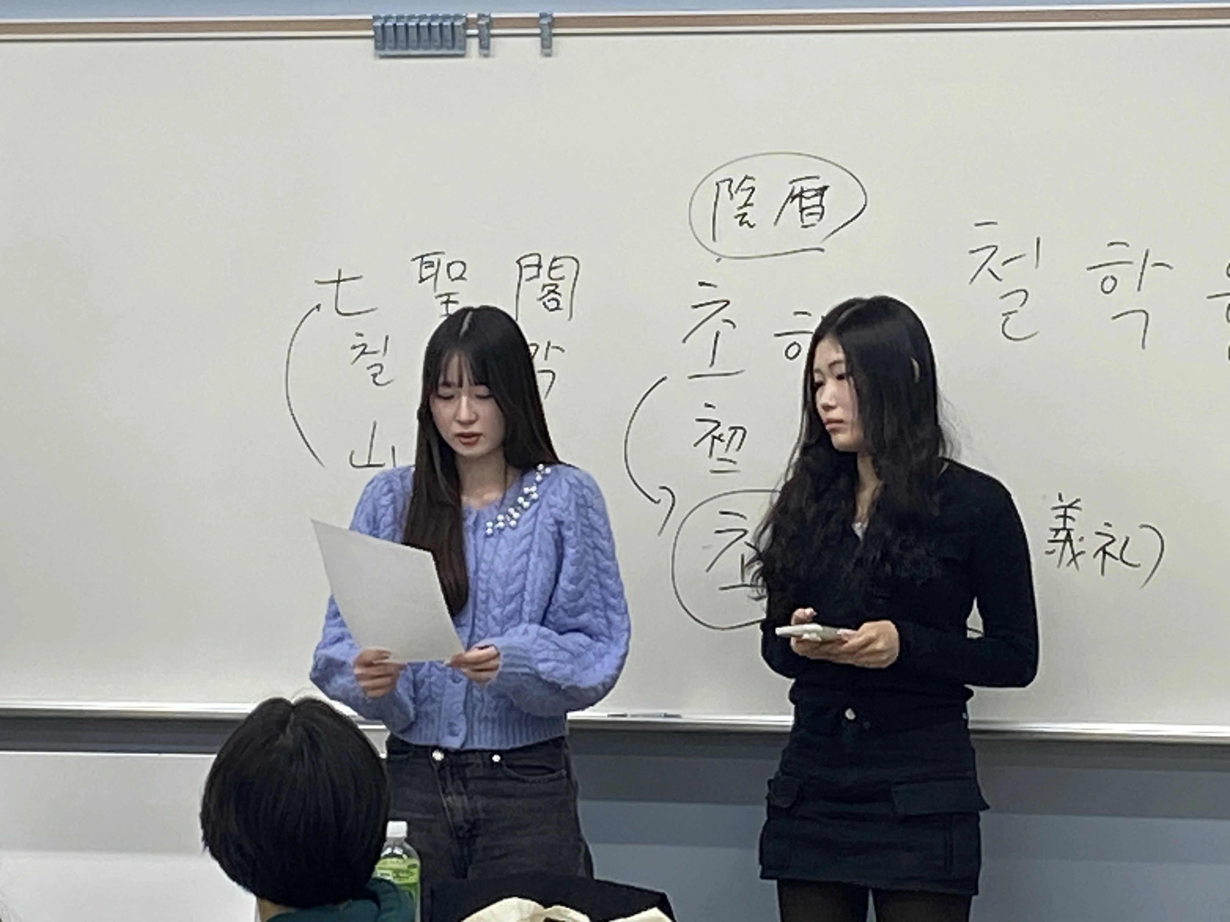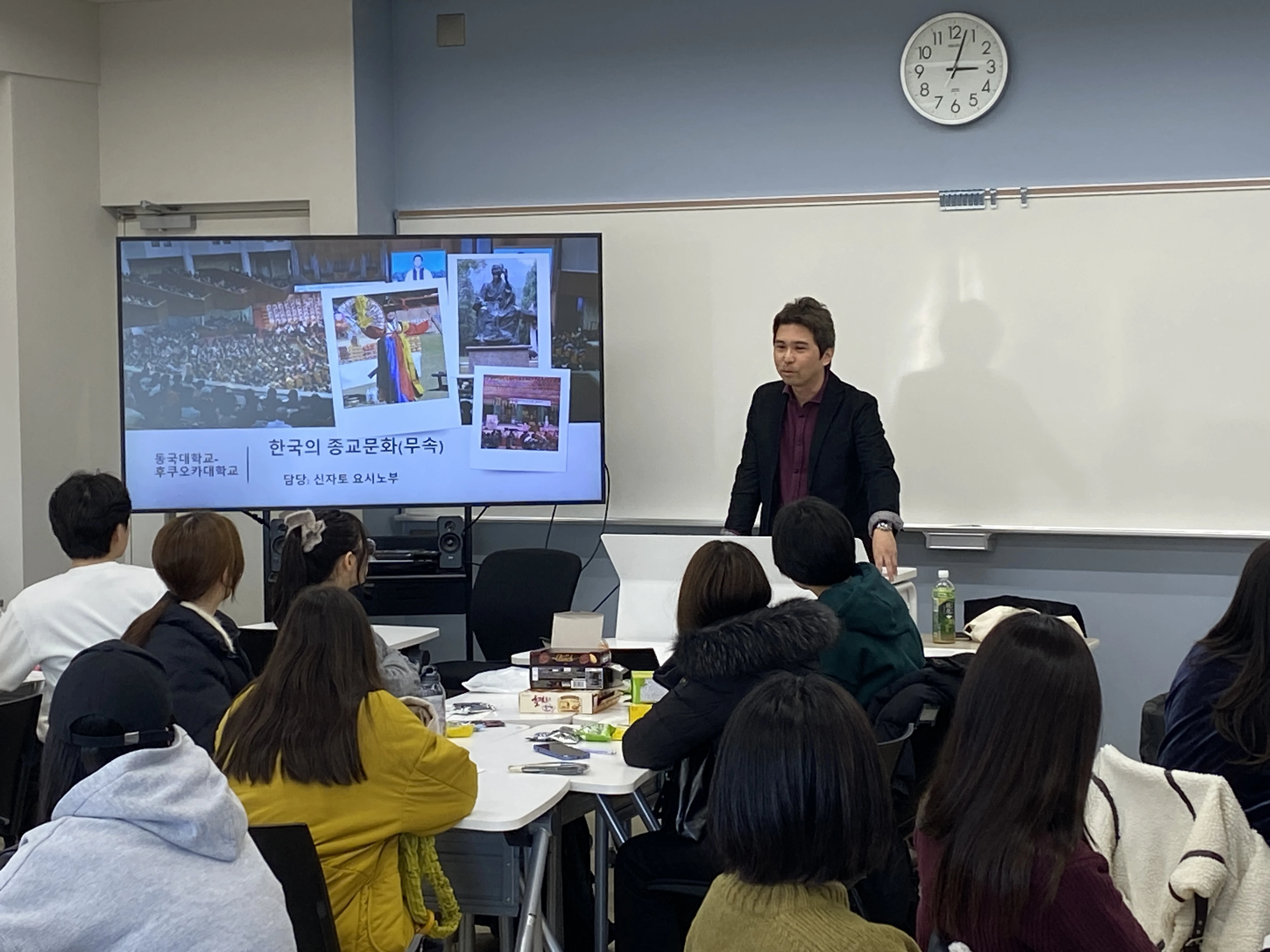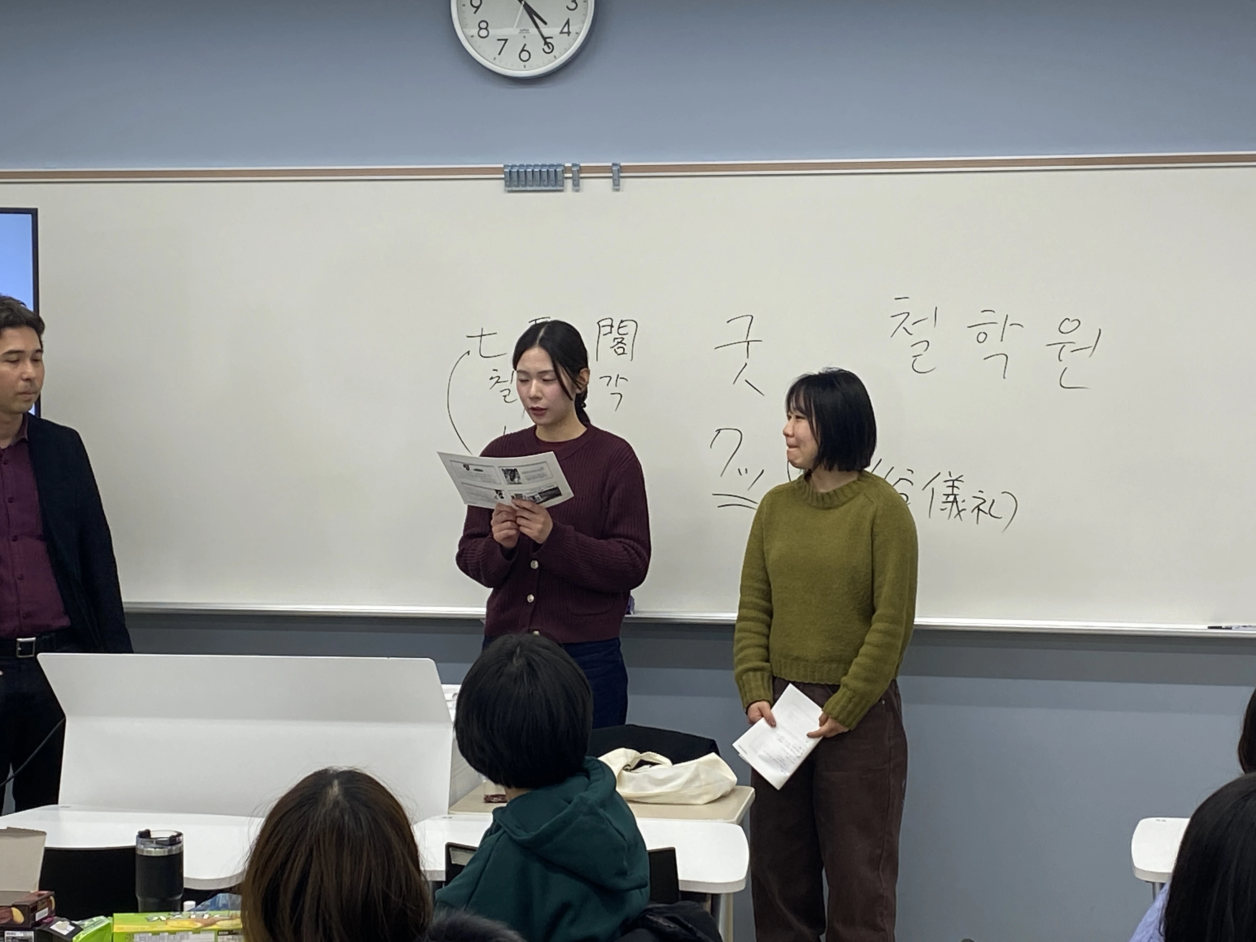 東アジア地域言語学科の新里喜宣准教授による特別講義「韓国の宗教文化(巫俗)」が行われ、韓国と日本社会における宗教認識を含めて、韓国社会における巫俗と韓国人の生活や文化との関係性について日韓学生グループで議論し、その感想を発表した。