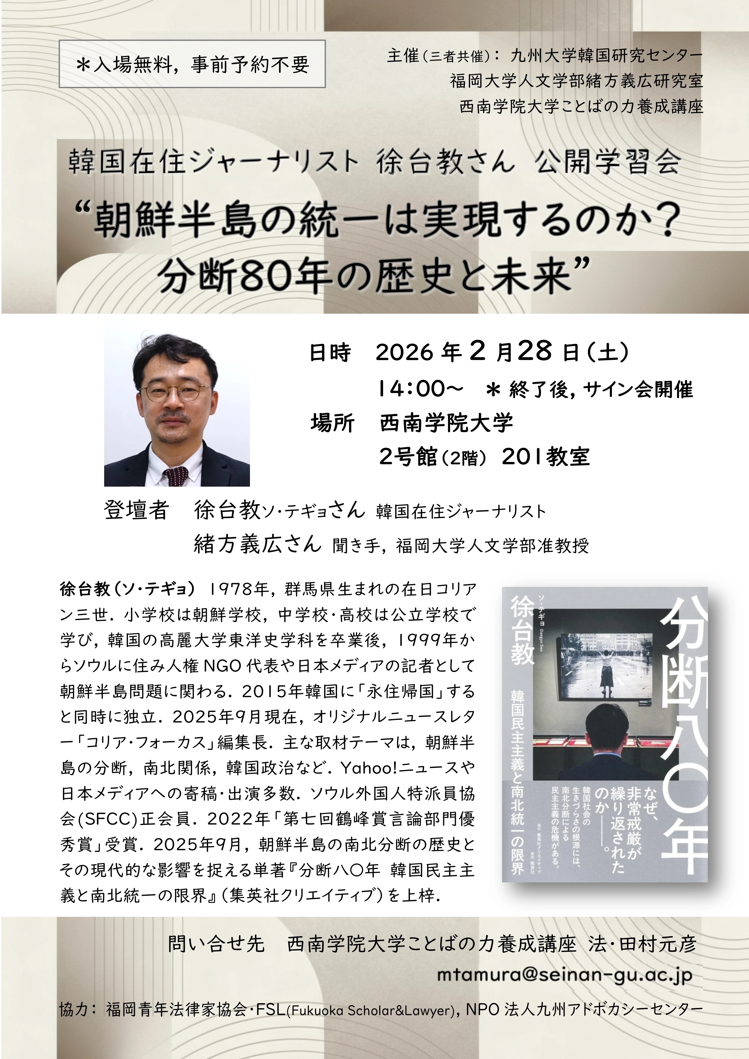【公開学習会】朝鮮半島の統一は実現するのか?分断80年の歴史と未来(徐台教さん)