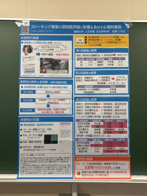 2月17日,西南学院大学で開催された九州学生心理学会において,私が指導した卒論生の岩瀬ひなたさんと,縄田先生が指導をご担当された池田琴美さんが,ポスター発表を行いました。今年の大会には,開催校の西南学院大学のほか,久留米大学,北九州市立大学,福岡県立大学から,心理学を学ぶ学部学生が参加していました。