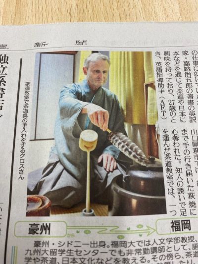 今月の読売新聞(11月11日)にTim Cross先生の特集記事が掲載されています。Tim先生は、福岡は勿論、様々な地域で文化活動を行っておりますので、その活躍は、新聞、テレビ、ネットメディアで多数取り上げられています。今回、読売新聞に掲載されているのは、ご本人の経歴は勿論、茶道家としての側面、さらにはサーフィンに従事されている先生の姿も紹介されています。