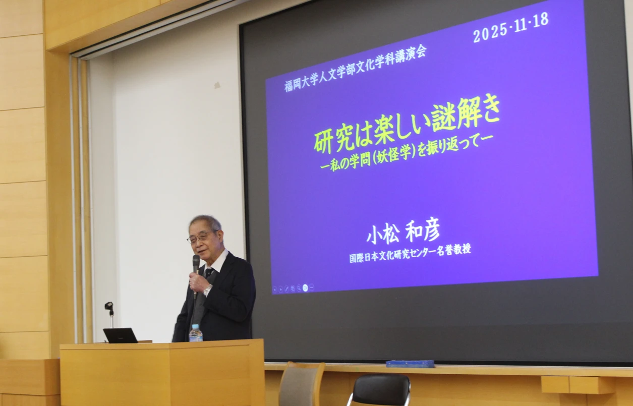 異界・妖怪研究の第一人者であり、令和7年度文化勲章の受章者である小松和彦先生(国際日本文化研究センター名誉教授)をお招きし、特別講演会「研究は楽しい謎解き―私の学問(妖怪学)を振り返って―」を開催しました。司会は、小松先生の弟子の髙岡弘幸先生(文化学科)が務めました。